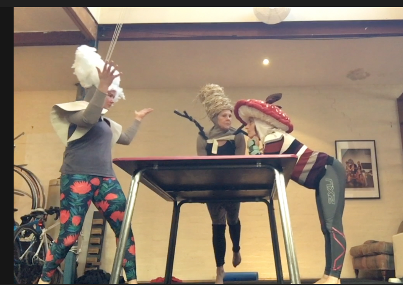 The table is a traditional circus apparatus, it is a territory with a language that includes tumbling, table sliding, and slapstick, historically a male act, we are de-territorialising[10] this circus act to interrogate the table as a meeting place, we are Zoe, we are the world, we are three women meeting or presenting as the world, maybe both? we are reworlding[11]. Perhaps this is a ridiculous notion. Daily we explore what the table affords us, there are opportunities and hindrances and both produce responses.[12] The table has domestic and corporate connotations; it is also surface, shelter, bridge, platform, obstacle, ledge, wall, cliff and more. We invite all of our collaborators to the table too, sound files, images for projection and dramaturgical provocations, we are open to disruption and flow.